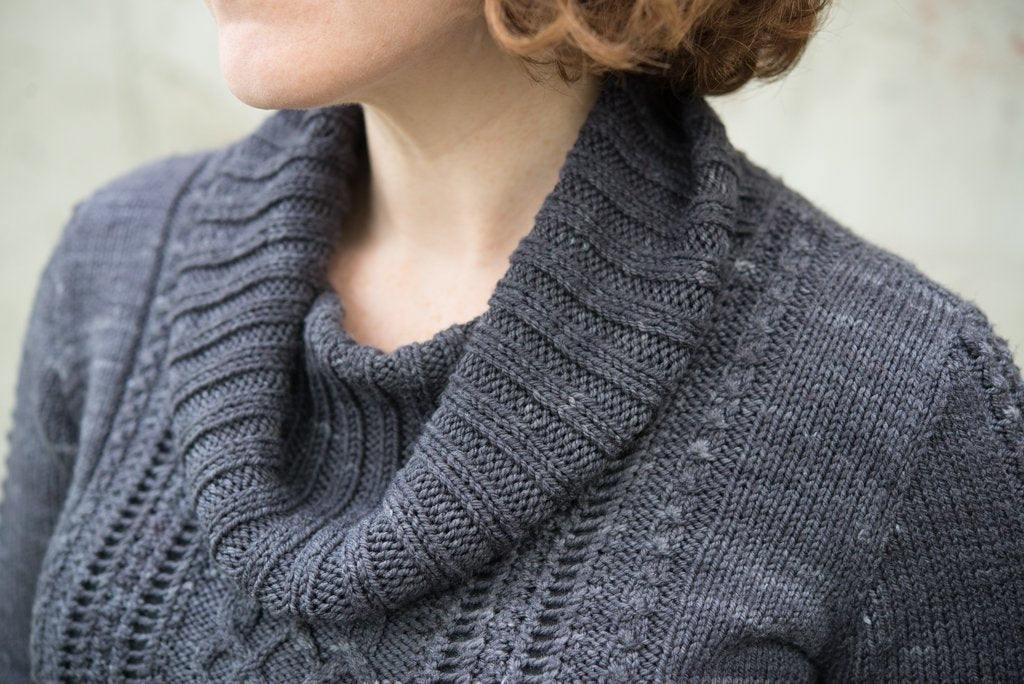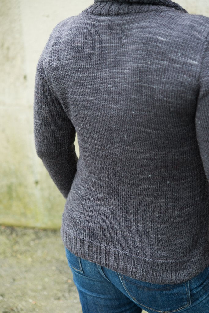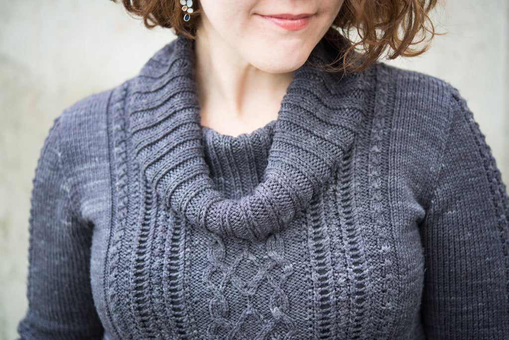 Alta is constructed in pieces from the bottom up, with set-in sleeves. The neckline is picked up and worked after seaming.