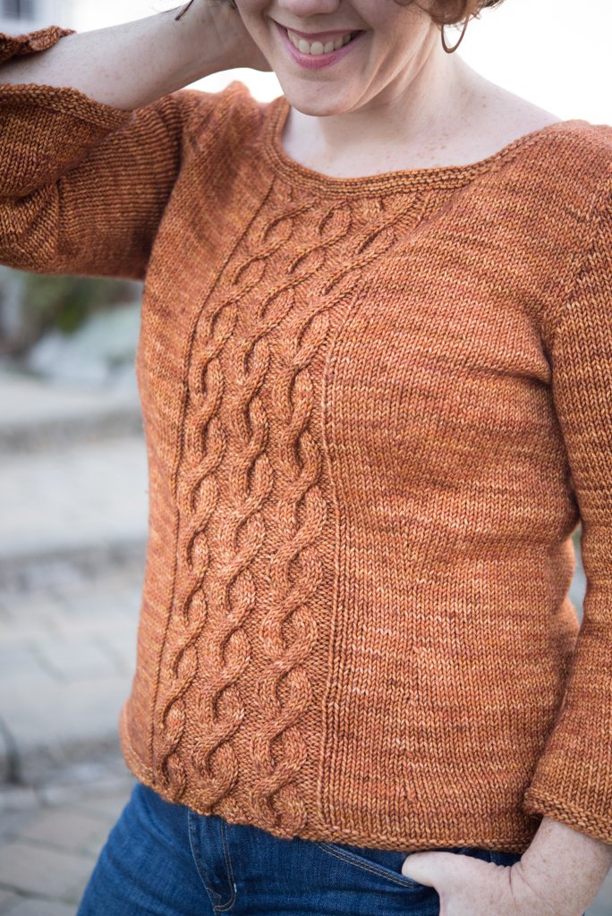 Birch Bark is worked in pieces from the bottom up and then seamed, with set-in sleeves. The shorter, slightly-belled sleeves and boat neck draw the eye up, while the dramatic cable panel on the front narrows the torso and captures the attention.