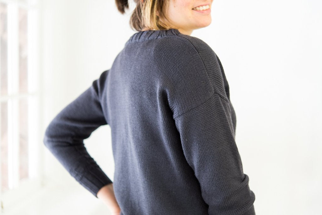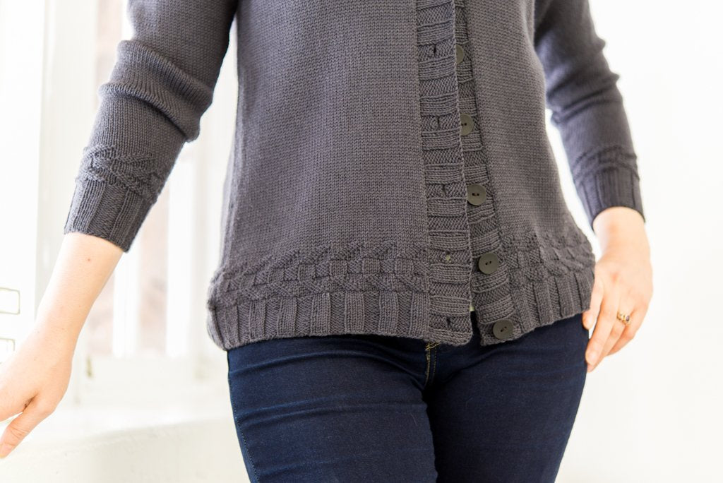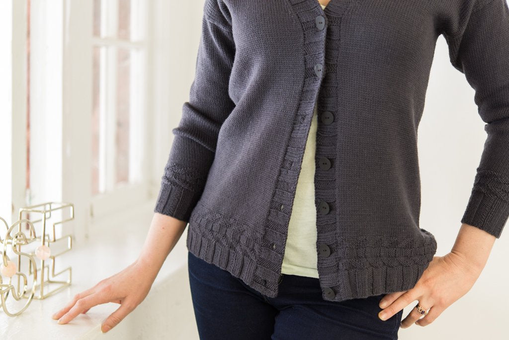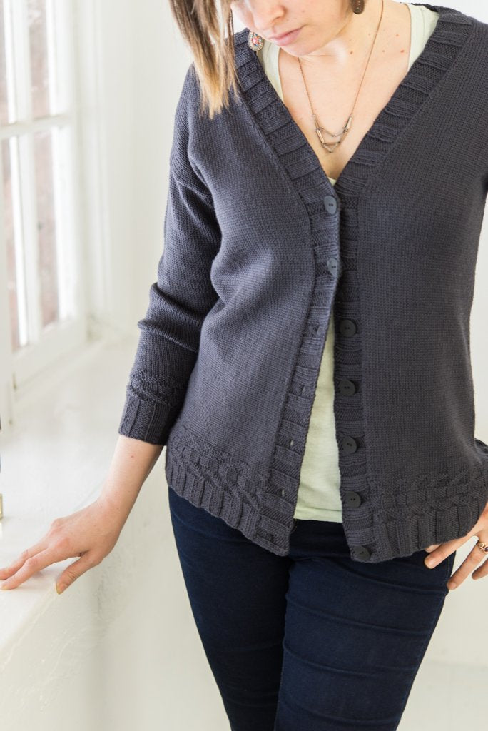 The Cedar Ledge Cardigan is part of my Spring 2018 Remarkable Yarns Collection: a set of four sweater patterns and three accessories designed to work equally well with both Rosy Green Wool and Crave Yarns Caravan. It's a classic V-neck drop shoulder cardigan with a fun gansey-inspired texture trimming the sleeves and sweater body. It's trimmed in chunky 4x4 ribbing, which makes a nice match for the cardigan's lightweight gauge.
