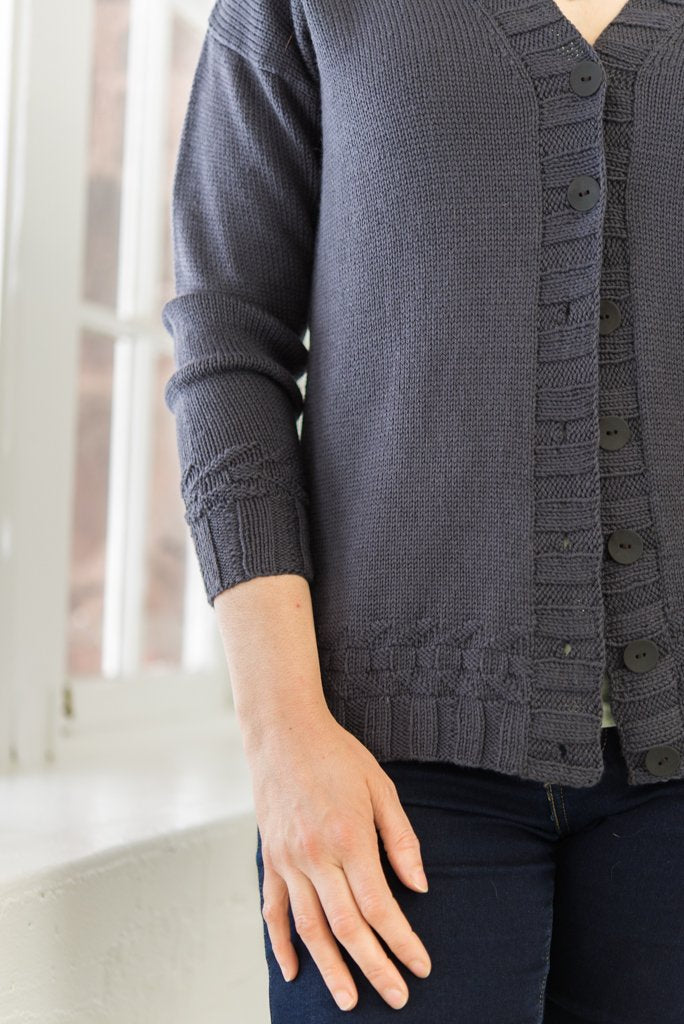 The Cedar Ledge Cardigan, like the rest of the Remarkable Yarns spring 2018 collection, is meant to work equally well with two yarns: