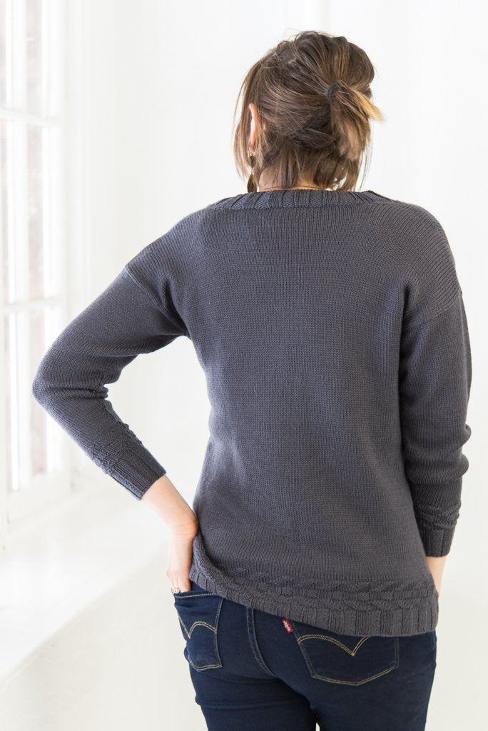 Cedar Ledge is worked in pieces from the bottom up and then seamed, with a drop-shoulder sleeve.