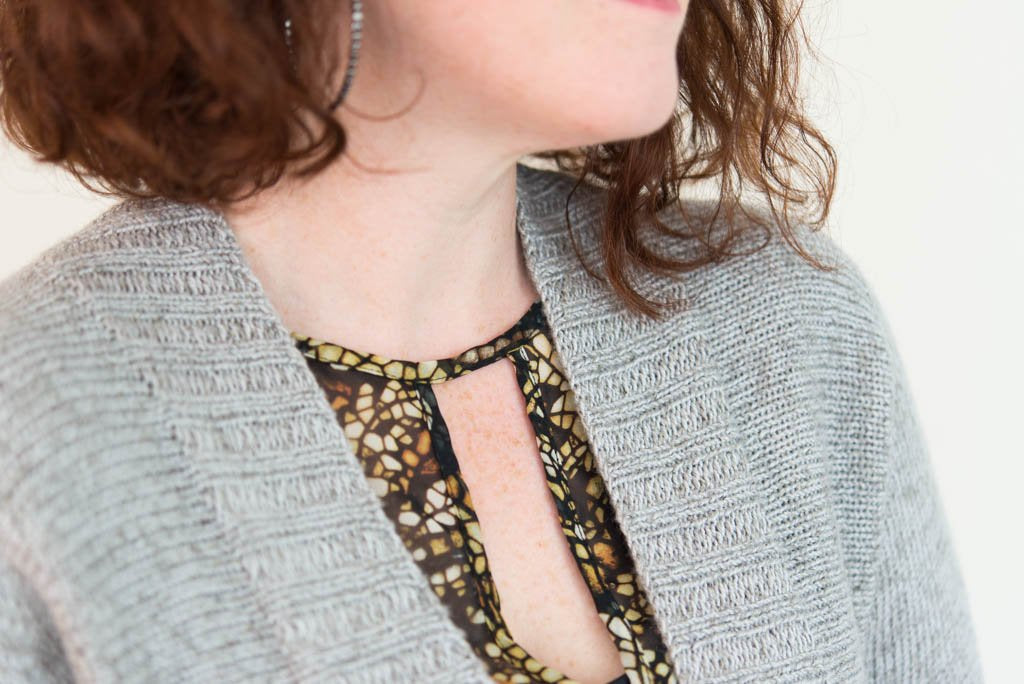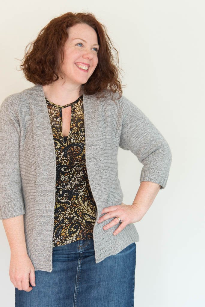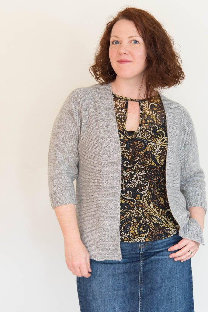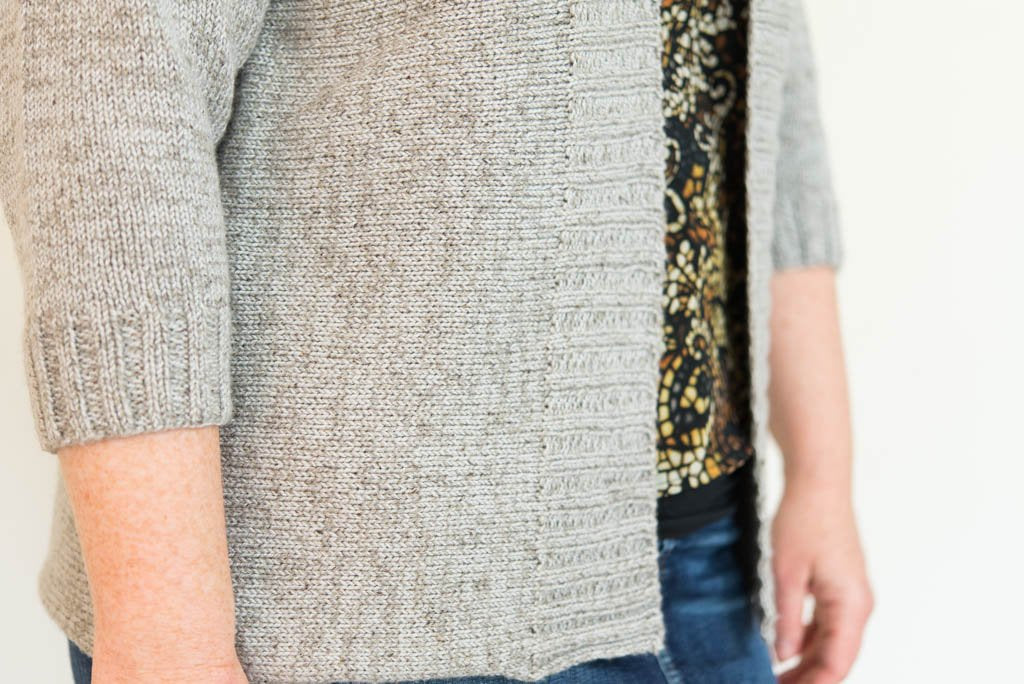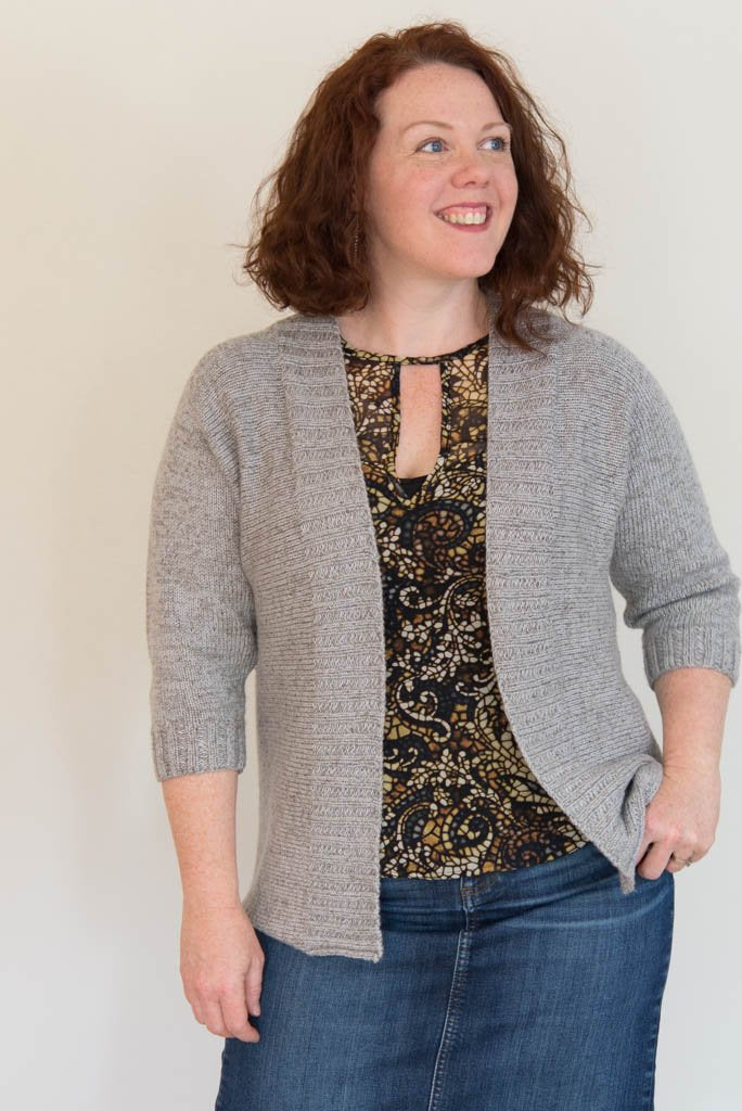 The strong vertical lines of open cardigans are flattering to most figures, and the heathered look of the combination of Shibui yarns I used makes a fabric that’s easily dressed up or down. (Also, be warned: It’s decadently soft and light.) In terms of wearability: Curlew's open front and 3/4 sleeves are easy to layer, and the narrow neck opening helps keep everything in place as you move. 2x2 ribbing trims the cardigan fronts and sleeve cuffs, and the bottom hem is unfinished, giving an ever-so-slight roll for a super-clean look.