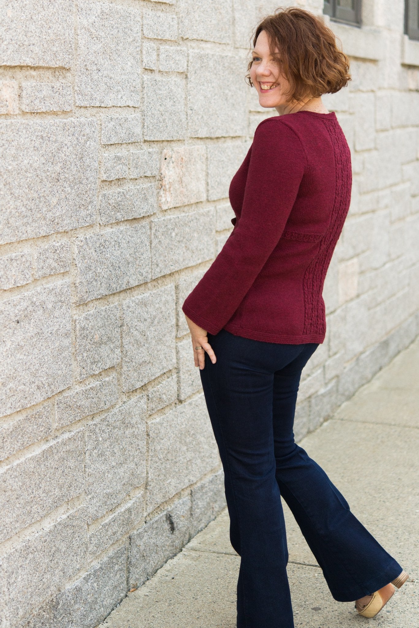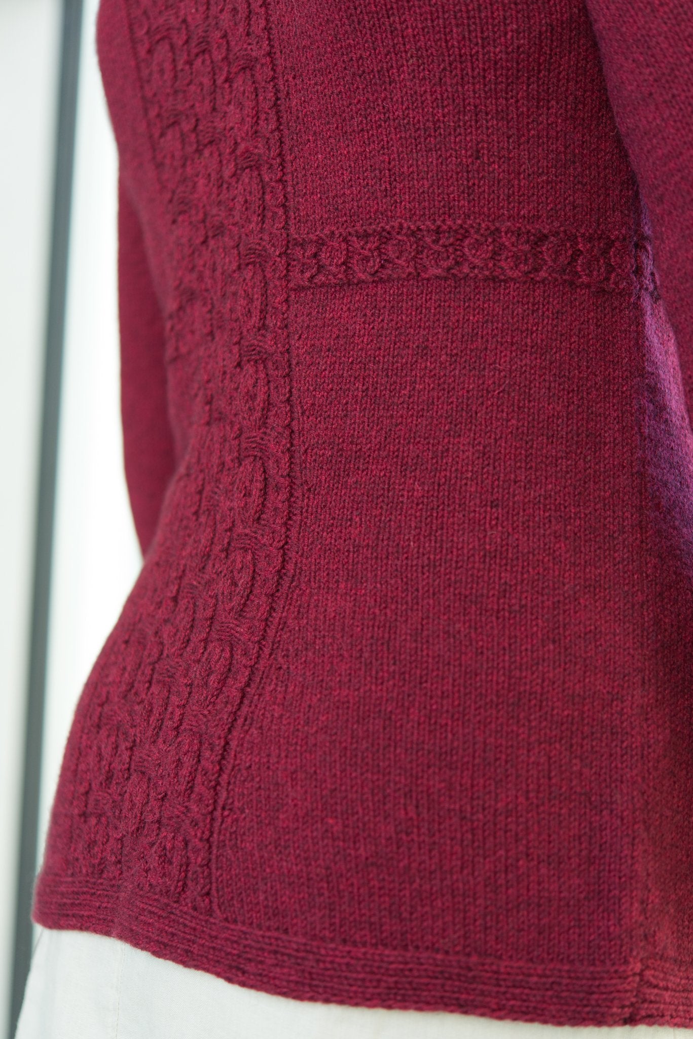 Dalriada's fundamental construction is a bottom-up set-in sleeve sweater that's seamed for stability. However, trims are worked perpendicularly to the hems and in-line for the button band, with stitch-pick-ups and mitred corners. Please read the instructions carefully before beginning.