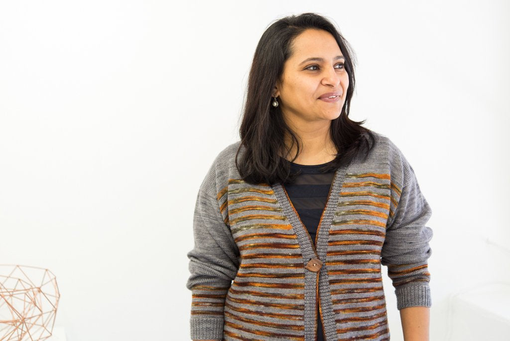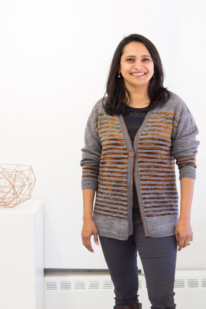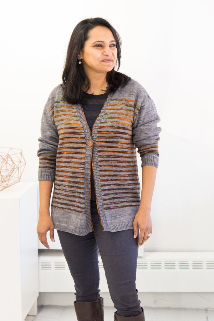 The Shorescape Cardigan combines fun gradient stripes and an updated drop shoulder silhouette for easy, entertaining knitting. I designed this sweater for my fall 2016 make. wear. love. retreat, using our vendor Indigodragonfly’s lovely CaribouBaa merino yarn. Fingering weight yarns make amazing drop shoulder sweaters, and they’re even better when you combine them with addictive color changes. A single button and flattering narrow V neckline finish this ultra-wearable piece.