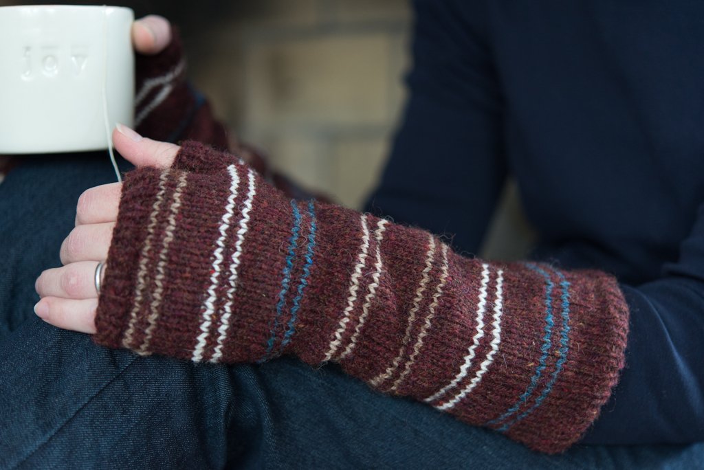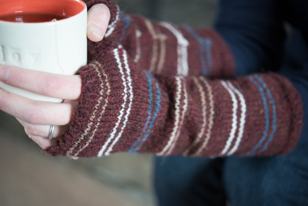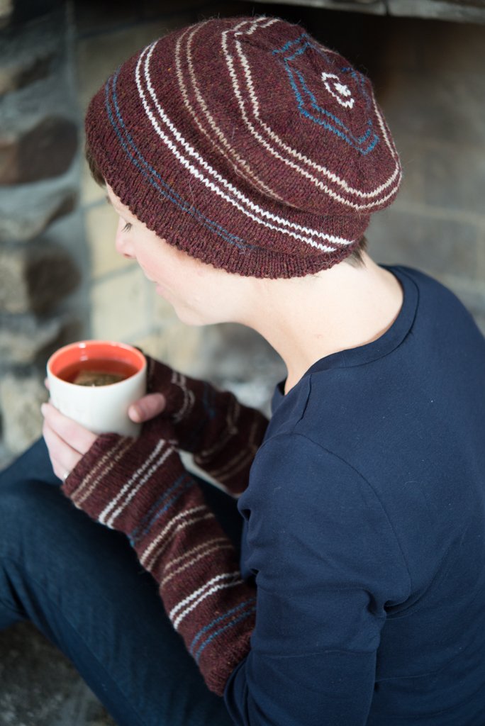 I wear hats and fingerless mitts inside all winter – what can I say? I keep it cold in here - and these have become my absolute favorites. The hat and mitts are both intended to be just a little slouchy, just a little broken-in in feeling. They should give you a hug, rather than stretch sleekly over your skin. I wanted the fingerless mitts, in particular, to feel like legwarmers, but for your arms - so they're shaped, with a long, slightly-slouched length.